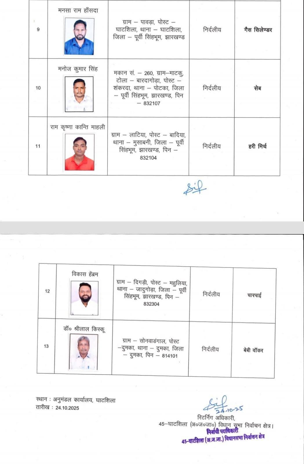 उमेश कांत गिरि / घाटशिला: घाटशिला विधानसभा उपचुनाव के नाम वापसी के समय खत्म होने के बाद चुनाव आयोग के द्वारा 13 प्रत्याशियों को चुनावी चिन्ह आवंटित किया गया. एक निर्दलीय प्रत्याशी विक्रम किस्कू उपचुनाव लड़ने से इनकार करते हुए नाम वापस ले लिया.