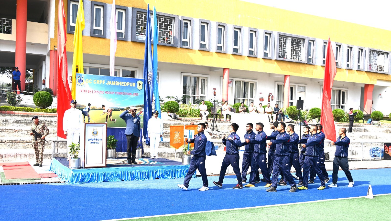 सीआरपीएफ ग्रुप केंद्र जादूगोड़ा, जमशेदपुर के तत्वावधान में झारखंड सेक्टर अंतर वाहिनी/ग्रुप केंद्र हॉकी प्रतियोगिता–2025 का भव्य शुभारंभ हुआ। समारोह के मुख्य अतिथि डीआईजी रमेश कुमार, ग्रुप केंद्र सीआरपीएफ जमशेदपुर, ने उद्घाटन संबोधन में प्रतिभागी खिलाड़ियों को अनुशासन और खेलभावना का आदर्श प्रस्तुत करने के लिए प्रेरित किया। उन्होंने भारतीय हॉकी के स्वर्णिम इतिहास की प्रतिष्ठा को पुनः स्थापित करने हेतु खिलाड़ियों को उत्कृष्ट प्रदर्शन के लिए प्रोत्साहित किया।