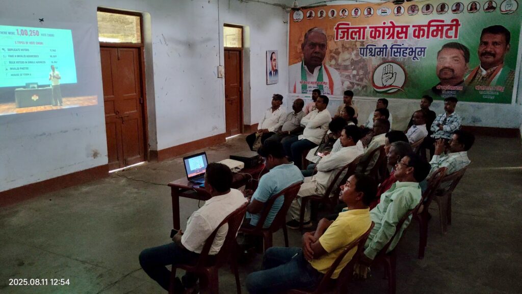 चाईबासा : लोकसभा में विपक्ष के नेता राहुल गाँधी द्वारा वोट चोरी प्रकरण का आंकड़ों एवं तथ्यों के खुलासे के बाद कांग्रेस आक्रामक हो गई है। सोमवार को कांग्रेसजनों ने प०सिंहभूम जिला मुख्यालय चाईबासा स्थित कांग्रेस भवन में वोट चोरी के विषय पर प्रजोक्टर के माध्यम से राहुल गाँधी का वीडियो प्रेजेंटेशन देखा ।